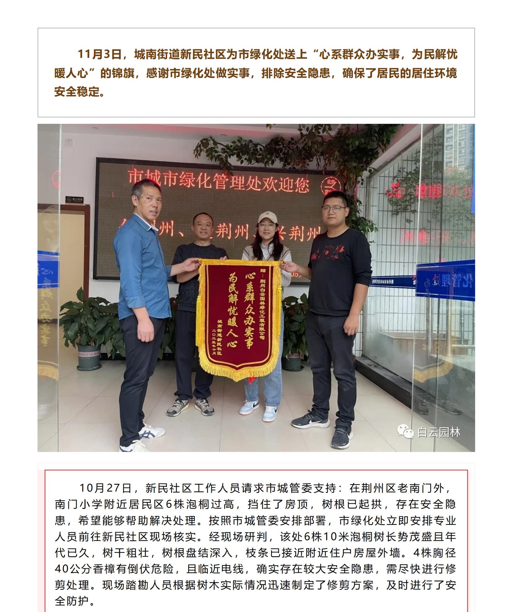 市綠化處|為民解憂(yōu)除隱患,及時(shí)處置獲錦旗